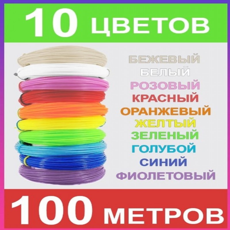 пластик для 3д ручки; пластик для 3D ручки; набор пластика для 3д печати 100 метров: 10 цветов по 10 метров