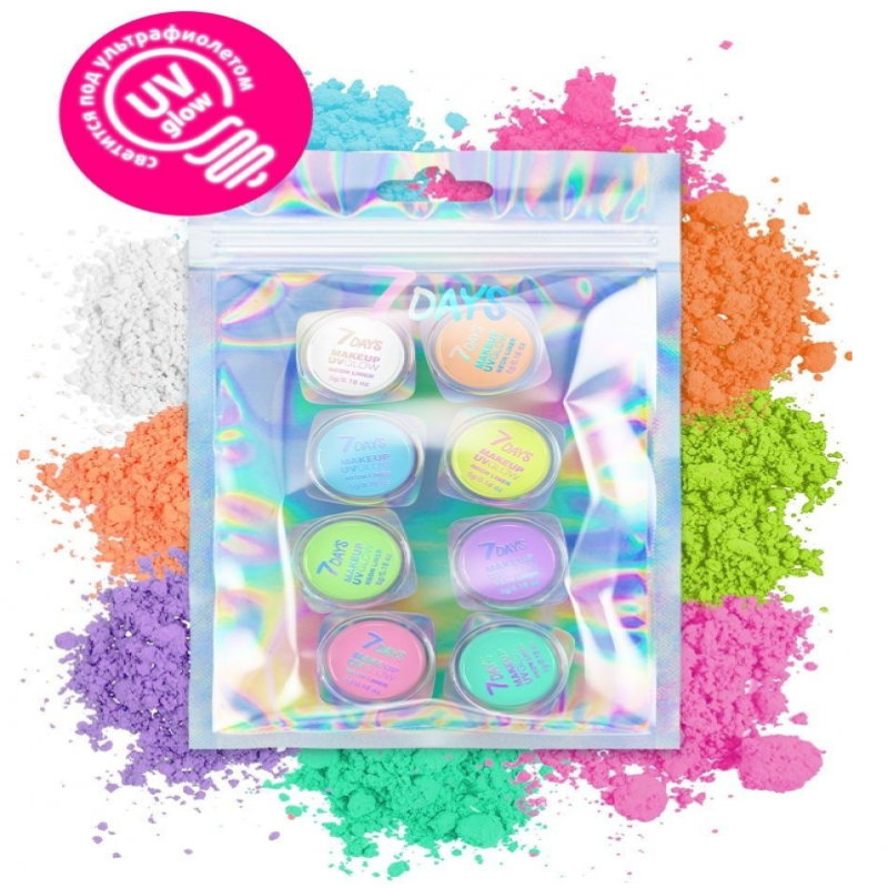 Хочешь невероятный арт-мейкап на лице или теле? Тебе необходим набор для макияжа глаз, лицо, тело - пастельные графические лайнеры для макияжа от 7DAYS. Это косметика, которая светится в ультрафиолете. Вооружись кистью необходимого размера, размягчи сухой пигмент небольшим количеством воды и давай креативить! Цветная подводка для глаз быстро высыхает, обладает высокой стойкостью и светится под ультрафиолетом. В косметическом наборе представлена разнообразная палитра оттенков: белый, нежно-сиреневый, персиковый, желтый, бирюзовый, нежно-голубой, нежно-розовый и лаймовый. Подводка для глаз и креативные рисунки на лице гарантированно обеспечат сияние на любой тусовке, концерте, вечеринке, съемке, фотосессии. Можно использовать как аквагрим. Применение: 1. Открой упаковку, добавь 2-3 капли воды, чтобы размягчить пигмент. 2. Для создания креативных макияжей воспользуйся косметической кистью необходимой толщины и формы. 3. После использования не трогай свежий макияж до полного высыхания.
