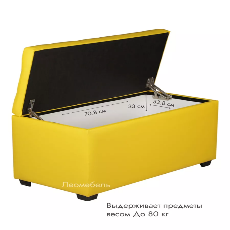 Пуфик 800-Я для прихожей (Ш 76; Г 39; В 44) имеет прочный каркас из белого ламинированного ДСП 16 мм и обивку из экокожи, можно протирать влажной тряпочкой и использовать в ванной комнате, сверху укрыт наполнителем из поролона 40 мм, по бокам 10 мм. Прочные петли дают надёжную фиксацию крышки в открытом положении. ПВХ ножки не царапают напольное покрытие, можно заменить на мебельные колеса. В накопительном коробе (330х708х338) под мягким сиденьем можно хранить: одежду, инструменты, постельное белье. Банкетка может служить подставкой под ноги, столиком в гостиной или кабинете у кресла, станет функциональным мягким стулом на кухне, ящик заменит обувницу в коридоре, гардеробной и вместит большое количество коробок с обувью, в детской комнате можно хранить игрушки, книги. Подойдет в дом на утепленный балкон и лоджию, украсит интерьер на даче и в квартире. Пуфик не требует сборки, максимальная нагрузка 150 кг. ПК-Леомебель более 20 лет на рынке, широкий ассортимент мебели.Сделано в России.