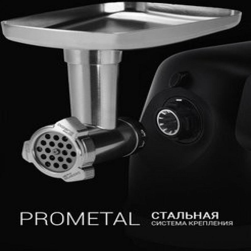 **Технология PROTech: усиливает крутящий момент и увеличивает эффективность работы. Технология PROtect+: дополнительная защита двигателя от перегрузки. Высокая производительность: до 2,7 кг в минуту!** Функция реверса. PROMETAL: Стальная система крепления. Нескользящие ножки. 3 диска из нержавеющей стали: 3 мм, 5 мм, 7 мм. Металлический лоток для мяса. Пластиковый толкатель. Насадка для приготовления колбас. Насадка для кеббе.