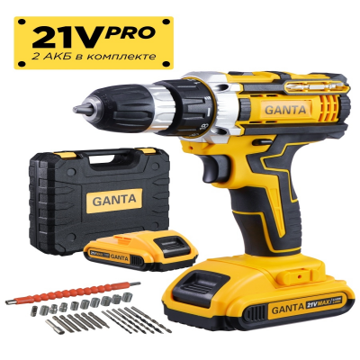 GANTA Шуруповерт аккумуляторный дрель GANTA 2102LI Pro, 2Ач, 21В, 1350 об/мин, 65Нм, 10мм, подсветка