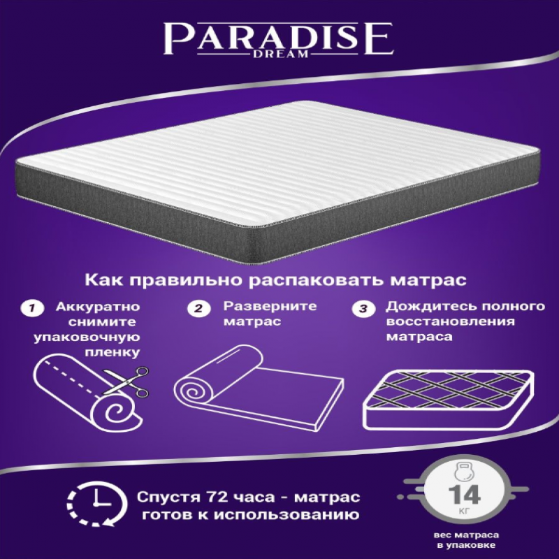 | Комплектация | размеры 180x200 160x200 140x200 120x200 90x200 80x200; матрас ортопедический двусторонний с эффектом памяти беспружинный в скрутке |
