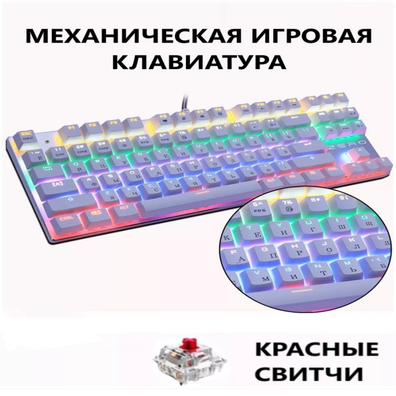 Клавиатура, клавиатура игровая, механическая клавиатура с подсветкой RGB ZERO X76 на красных, синих или черных свитчах. Выбор покупателей по всему миру! Клавиатура механическая, каждая кнопка сделана с использованием отдельного переключателя (свитча). Игровая клавиатура, качественная, с красивым дизайном и приятной упаковкой. Игровая клавиатура имеет провод в матерчатой оплетке и дает приятные ощущения при нажатии на клавиши. В механической игровой клавиатуре использованы свитчи зарекомендовавшего себя производителя JIXIAN. В наличии клавиатура белая и черная; с черными или белыми клавишами на красных, синих и черных свитчах. Клавиатура с красными свитчами позволяет пользователю легко и относительно тихо нажимать на клавиши, такие свитчи стоят в большинстве игровых клавиатур. Клавиатура игровая с синими свитчами отличается характерным щелчком при нажатии. На такой клавиатуре довольно легко и быстро печатать, клавиатура имеет ясную точку нажатия и высокую скорость возвращения в изначальную позицию. Механическая клавиатура с черными свитчами имеет почти неслышный звук при достижении точки нажатия и требует чуть больше усилия при нажатии. У такой клавиатуры отсутствует тактильная отдача, в основном такая игровая механическая клавиатура используется геймерами в шутерах или RTS.