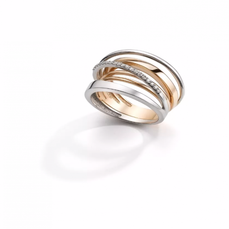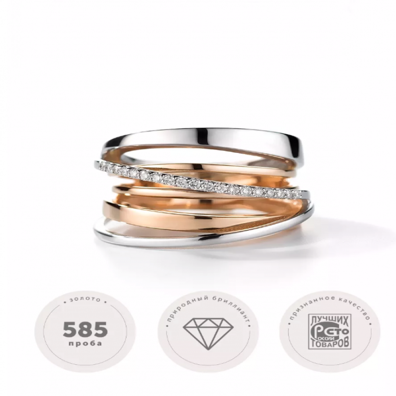 Стильное кольцо из красного и белого золота с бриллиантами, в нем вы не останетесь незамеченной! Несколько переплетённых колец создают иллюзию парящих в воздухе бриллиантов. Ширина шинки 17 мм, 19 Бриллиант Круг 57 0,137 120-200 4/5А. Каждое наше украшение - это маленький шедевр ювелирного искусства, инкрустированный природными бриллиантами премиального качества и контролируемого происхождения. Качество - наш главный приоритет! Поэтому украшения АЛЬКОР много лет подряд становятся лауреатом конкурса "100 лучших товаров России". Также в нашем ассортименте есть кольцо золотое, золотое кольцо женское, кольцо золотое 585 женское, золотое кольцо 585 пробы женская, золото 585, кольца золотое, кольцо с бриллиантом золотое, кольцо женское, кольцо на большой палец, кольцо с камнем, помолвочное кольцо. Украшения АЛЬКОР приходят в комплекте с фирменной упаковкой (конверт) - идеальный подарок любимой женщине, девушке, девочке на День рождения, Новый год, 8 марта, день всех влюбленных (14 февраля) - на любой праздник и повод. Значение веса и характеристики являются усредненными и могут отличаться от фактических. Развернуть описаниеОписание