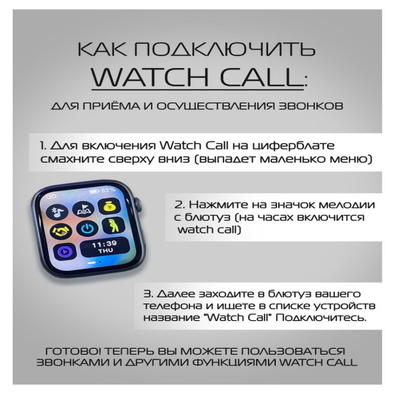 Smart Watch 7 – актуальная и функциональная модель умных часов с увеличенным ярким дисплеем и усиленной батареей, абсолютный тренд этого года! Умные смарт часы, содержат в себе функции фитнес браслета, послужат как наручные часы и станут ярким стильным аксессуаром для любого образа благодаря двум разным ремешкам, металлический ремешок миланская петля идёт в подарок. Часы наручные сопрягаются со смартфонами apple IOS ( эпл айос ) и Android ( Андроид ) с версией Bluetooth 5.0 (с более старыми версиями возможно некорректное подключение) и выше способны работать в режиме ожидания до 5 дней, а в активном использовании держат заряд до 2 дней. Тонкие рамки и большой Full Screen дисплей с разрешением 390х435 позволяют взаимодействовать с электротехникой смарт вотч максимально комфортно, сенсор с высокой чувствительностью, плавная анимация виджетов и улучшенный процессор обязательно вас порадуют. Электронные часы смарт воч наручные – отличный универсальный аксессуар и полноценный гаджет, используется как часы для женщин, часы для мужчин, часы для детей, как фитнес-браслет и имеет множество таких полезных функций, как: пульсометр, тонометр, секундомер, калькулятор, совершение и прием звонков, управление камерой и музыкой, просмотр погоды, просмотр уведомлений из мессенджеров ( в зависимости от модели вашего телефона и разрешения приложений), пульсоксиметр, напоминание о здоровье и приеме воды, отслеживание сна, фонарь (усиленное свечение дисплея) разнообразные спортивные режимы и другие (часы не являются медицинским прибором). Смарт вотч 7 серии – часы мужские и женские, являются качественным, но более бюджетным аналогом популярных моделей часов таких марок, как Samsung (самсунг), apple watch series (часы эпл вотч), xiaomi (сяоми) и послужат отличным подарком на любой праздник, будь то новый год или день рождения, для мужа, парня, брата, мальчика, девочки, жены, сестры, любимой или для себя. Приложение для часов Wear Pro доступно для iOS и Android, а функции звонков доступны с подключением Watch Call.