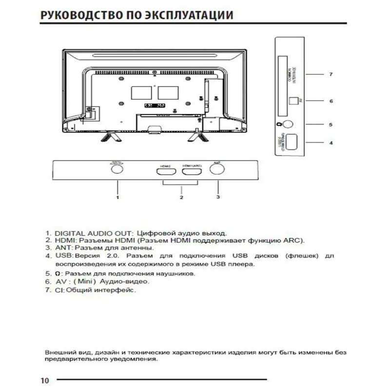 Диагональ 24 дюйма (61 см), встроенный цифровой тюнер DVB-T2/DVB-C (H.264 MPEG 4/2/1). Разрешение 1366 x 768 HD с динамической контрастность 80000:1. Формат экрана 16:9, формат изображения 16:9, 4:3, Авто. Комфортная яркость экрана до 220 кд/м2. Угол обзора составляет 178/178, экран воспроизводит 16,7 млн цветов. Частота обновления: 60 Гц. Динамики 2*6 Вт. Модель оснащена гостиничным режимом (режим Отель), 3D цифровым фильтром, который оптимизирует изображение при наличии помех. Поддерживает устройства USB, такие как флэш-USB, внешние жесткие диски, MP3-плееры и другие соответствующие стандарту USB 2.0. Интерфейсы: аудиовыход 2Х6 Вт, видеовход Video: 75 Ом, 1,0 В (размах), аудиовход AUDIO: 10 кОм, 05 В(действующее значение), USB1.1/USB2.0, AV: (Mini) аудио/видео вход, CI: слот для подключения карты условного доступа, DIGITAL AUDIO OUT (цифровой аудио выход), ANT (разъем для антенны), HDMI - 2 разъема (поддерживает функцию ARC). Размер телевизора с ножками 55,2 Х 36,9 Х 15,2 см. Свернуть описание